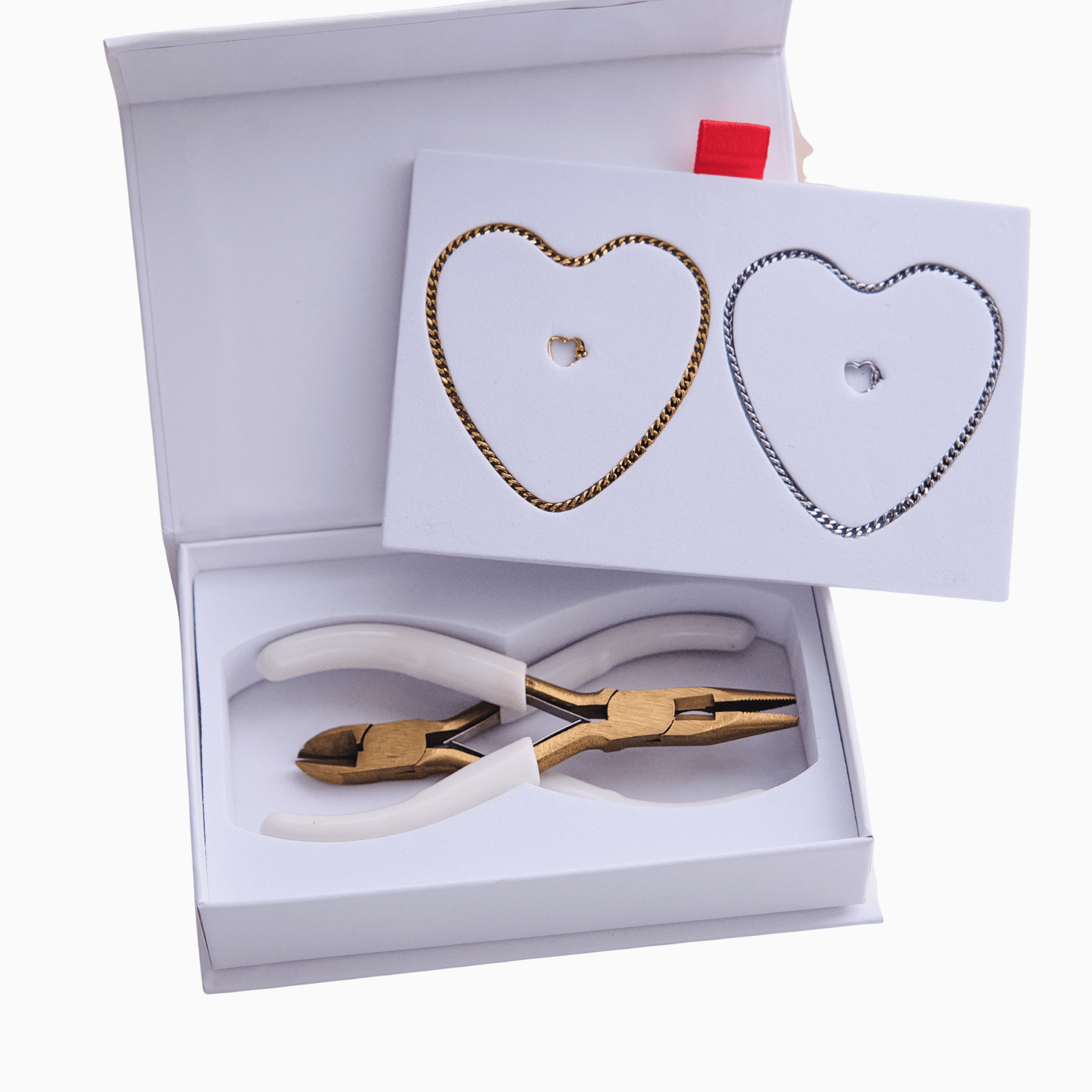Each set consists of two permanent bracelets, two specially designed clasps, wire cutters for individually adjusting the length, and pliers for securely closing.